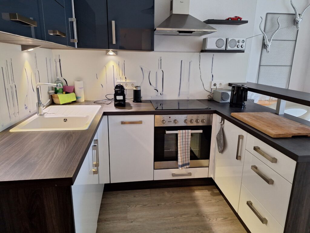 Die voll ausgestattete Küche mit großem Esstisch ist der perfekte Ort, um gemeinsam zu kochen, zu essen oder einfach gemütlich beisammenzusitzen.